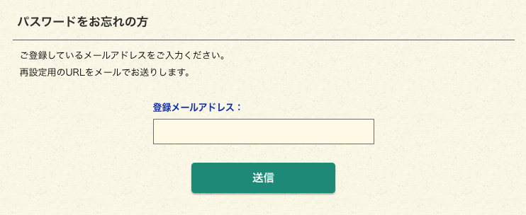 会員ログインページの下にある「パスワードをお忘れの方」からメールアドレスを送信いただくと、パスワードを再設定頂けるURLをご登録いただいたメールアドレスにお送りいたします。