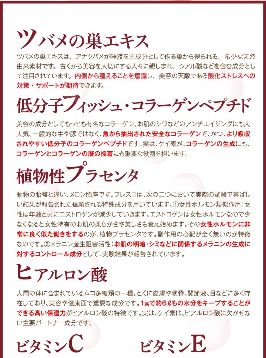 その他超有名美容成分「フィッシュ・コラーゲンペプチド」「植物性プラセンタ」「ヒアルロン酸」「ビタミンC」「ビタミンE」も配合されており、ビタミンCとビタミンEの栄養機能食品でもあります。