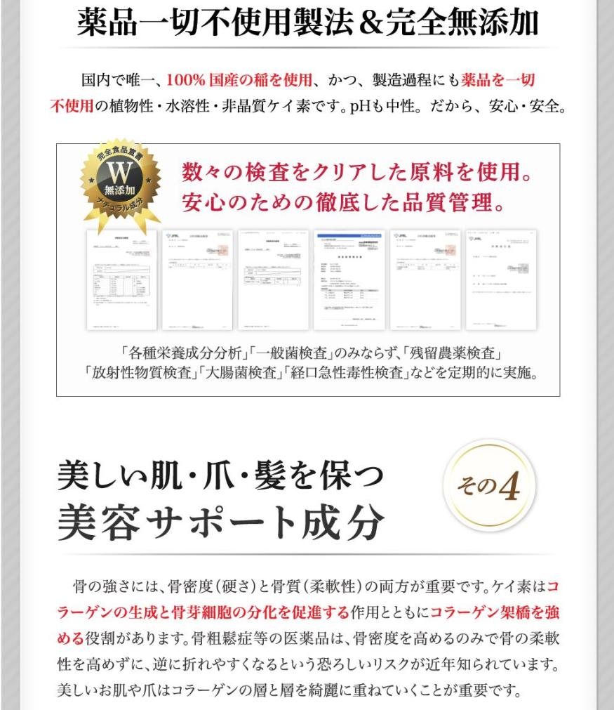 これは今までに色々なサプリメントを飲みましたが、こんなに体の変化を感じたのは初めてです。毎日1時間ほど歩いていますが疲れにくくもなりました。ケイ素に出会って本当に感謝しています。ありがとうございます。