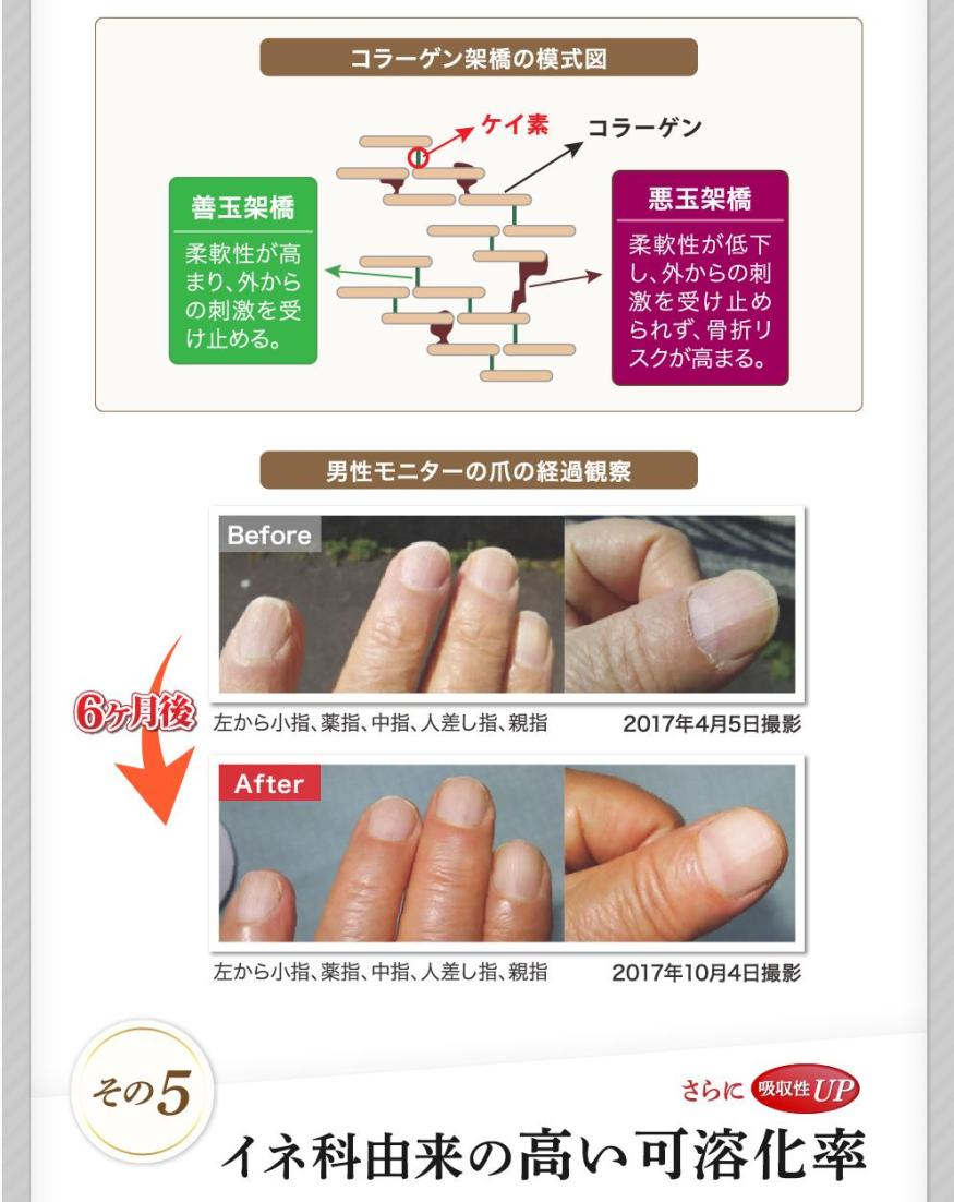 骨の強さには、骨密度(硬さ)と骨質(柔軟性)の両方が重要です。ケイ素はコラーゲンの生成と骨芽細胞の分化を促進する作用とともにコラーゲン架橋を強める役割があります。骨粗鬆症等の医薬品は、骨密度を高めるのみで骨の柔軟性を高めずに、逆に折れやすくなるという恐ろしいリスクが近年知られています。美しいお肌や爪はコラーゲンの層と層を綺麗に重ねていくことが重要です。