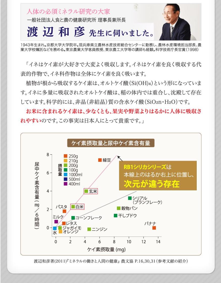 「イネはケイ素が大好きで大変よく吸収します。イネはケイ素を良く吸収する代表的作物で、イネ科作物は全体にケイ素を良く吸います。 植物が根から吸収するケイ素は、オルトケイ酸(Si(OH)₄)という形になっています。イネに多量に吸収されたオルトケイ酸は、稲の体内では重合し、沈殿して存在しています。科学的には、非晶(非結晶)質の含水ケイ酸(SiO₂n・H₂O)です。 お米に含まれるケイ素は、少なくとも、果実や野菜よりはるかに人体に吸収されやすいのです。この事実は日本人にとって貴重です。」