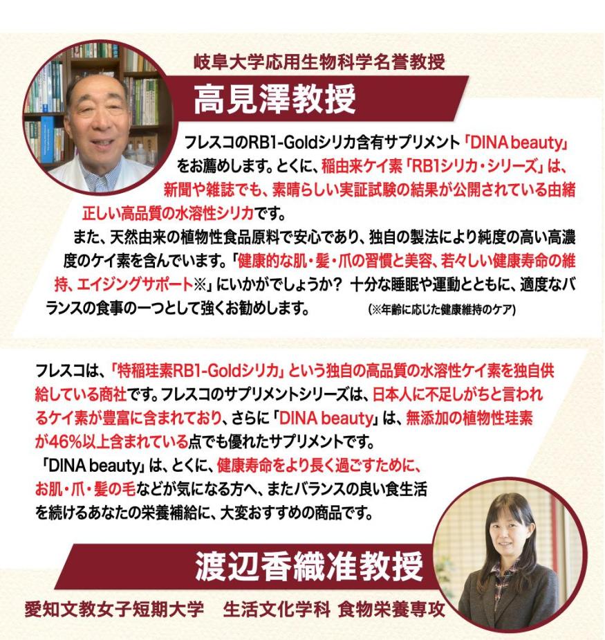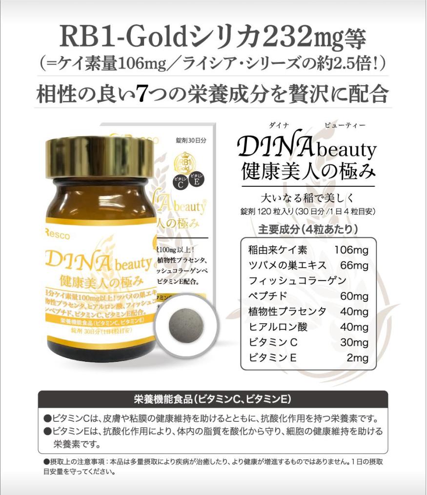 DINA beauty(ダイナビューティー)は、大人気の稲由来ケイ素「RB1-Goldシリカ」配合の高品質な美容サプリメントです。植物性・水溶性ケイ素を通常品の2.5倍増の106mg。