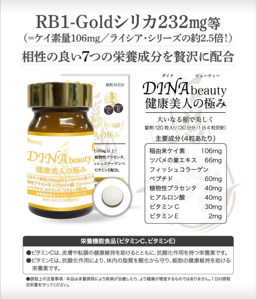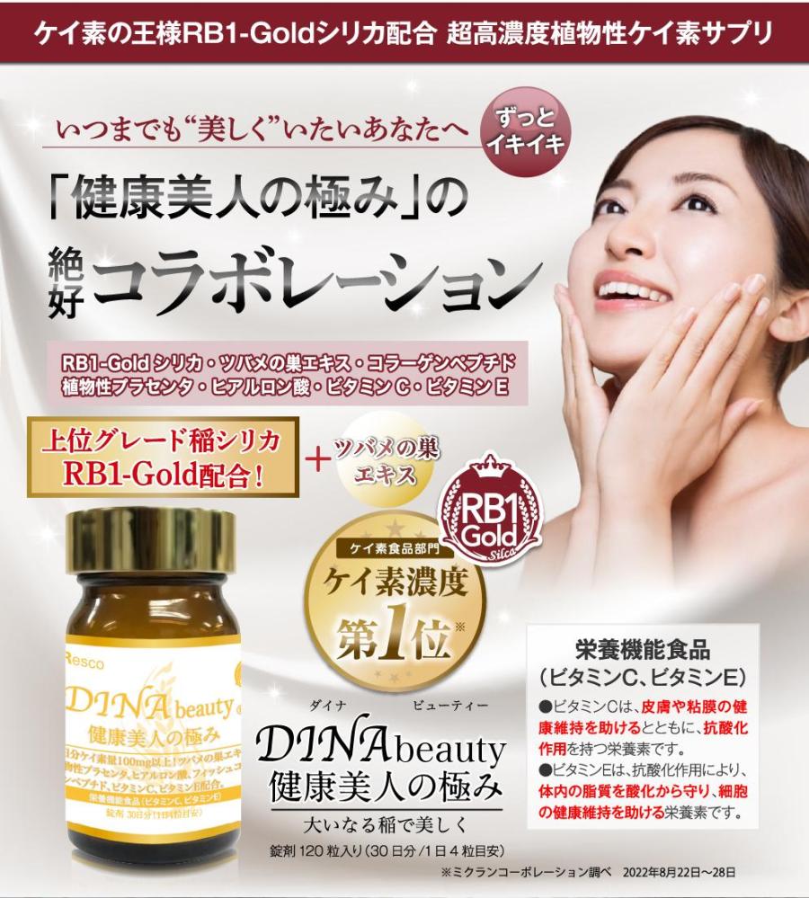 DINA beauty(ダイナビューティー)は、大人気の稲由来ケイ素「RB1-Goldシリカ」配合の高品質な美容サプリメントです。植物性・水溶性ケイ素を通常品の2.5倍増の106mg。